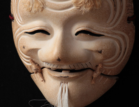 知恵と安らぎの象徴であり「翁は能にして能にあらず」といわれ能楽以前より神の象徴として天下太平、国土安穏、五穀豊穣を祈願する祝の曲「翁」のための面である。