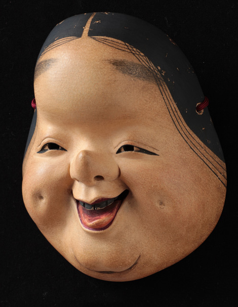 極端な下ぶくれの丸顔で当然美人ではないが、どこか愛嬌と存在感の重みが感じられる。 能面創作期の女面の名工竜右衛門作と伝えられる。